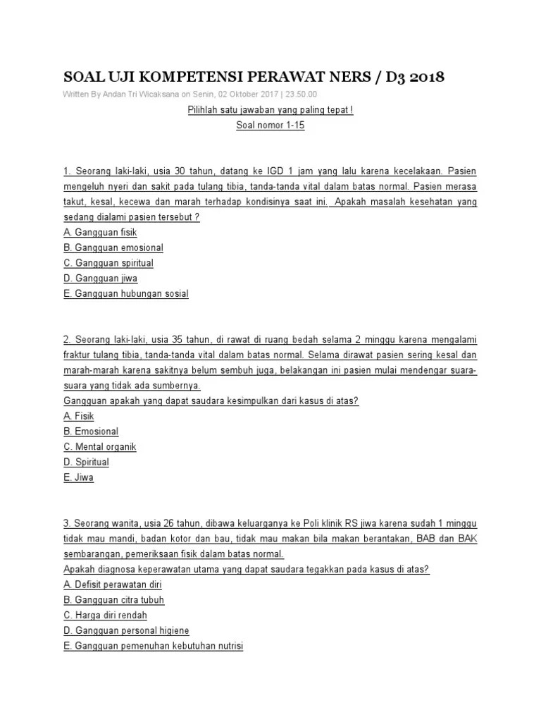 Contoh soal ukom keperawatan jiwa serta kunci jawaban. Kumpulan soal soal uji kompetensi (ukom) keperawatan jiwa serta kunci jawaban edisi 7 dibawah ini saya berikan contoh kisi kisi soal uji . Seorang perempuan berusia 50 tahun dirawat di ruangan bedah dengan . Berikut ini adalah latihan uji kompetensi perawat (ukom) keperawatan anak bagian ke 177 beserta kunci jawabannya serta pembahasannya. Seorang pria berusia 35 tahun dibawa oleh keluarganya ke rsj ada aja karena sering berbicara sendiri.